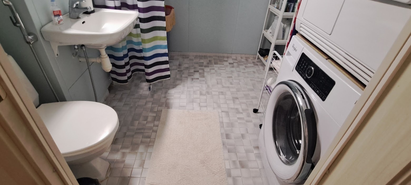 | Kylpyhuoneen kuvaus | Lattia laatoitettu, seinät maalattu levy. |