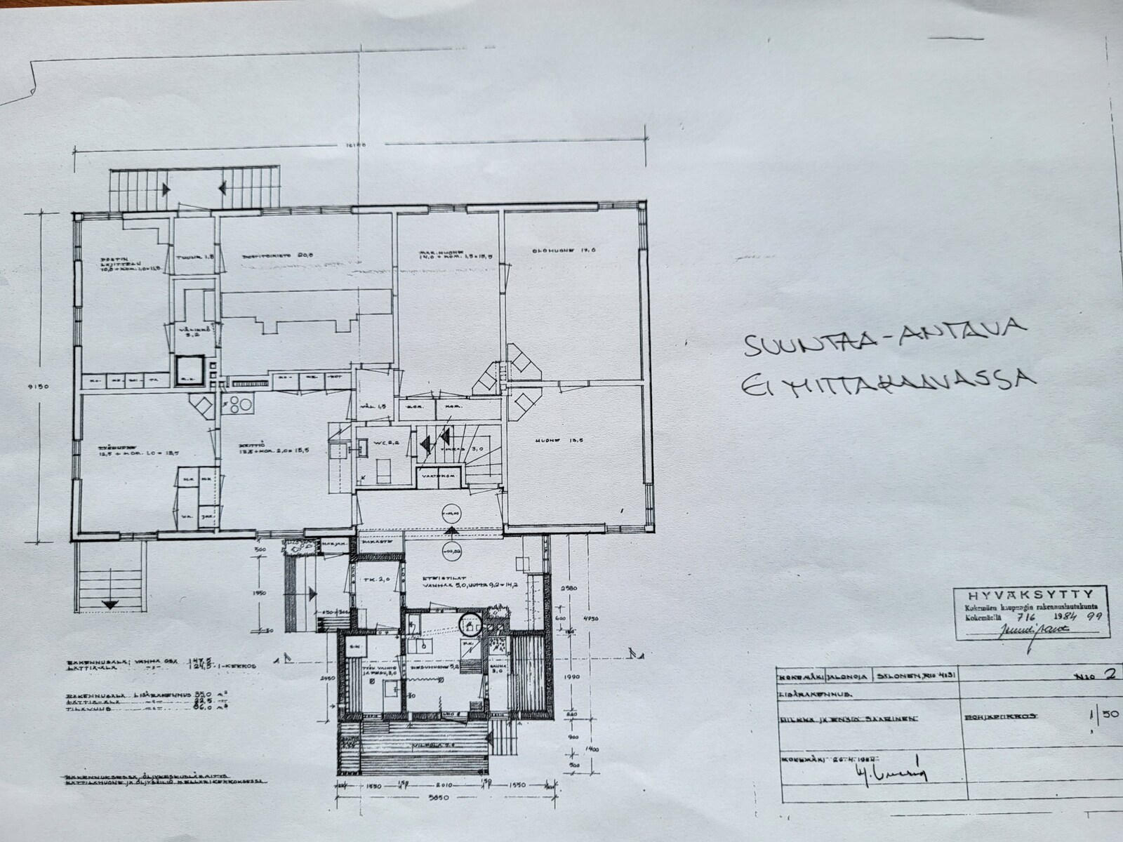 | Lisätietoja pinta-alasta | Pinta-ala piirustuksissa ilmoitettu, ei tarkistusmitattu, pinta-alassa vain 1. krs, lisäksi kellaritilat ja vinttitilat, jossa kaksi kesähuonetta |